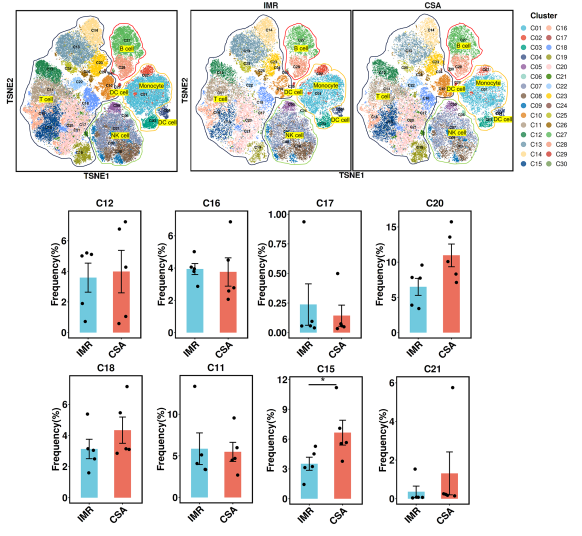 进一步通过多组学联合分析(CyTOF免疫表型分析、bulk RNA测序及血浆炎症因子检测),研究系统揭示了该免疫异常的关键特征:CSA组患者表现为效应性和衰老型CD8⁺ T细胞显著扩增、调节性T细胞减少,并伴随IP-10、MCP-1、CD163等炎症因子水平升高,提示持续性系统炎症状态。此外,转录组分析显示该人群中免疫炎症通路、趋化因子信号通路及抗原呈递相关通路显著激活,进一步支持CD8⁺ T细胞驱动的免疫失调机制。