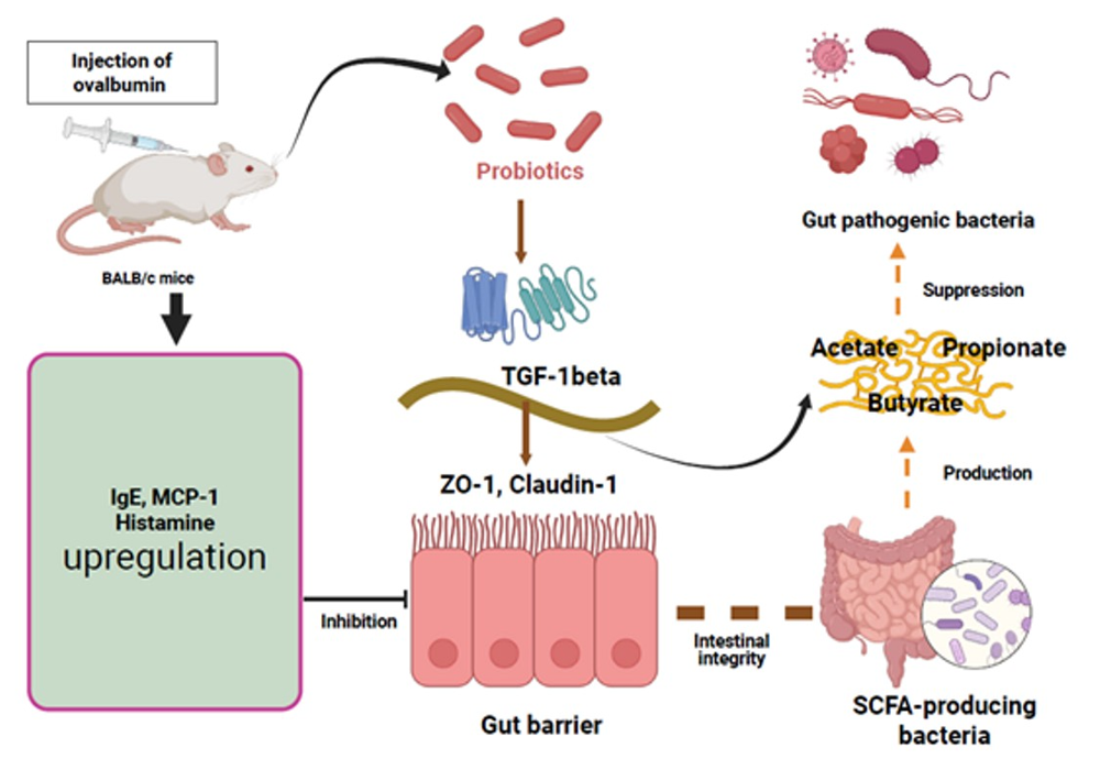 全球食物过敏(FA)患病率的上升迫切需要创新的治疗策略。本研究通过小鼠模型,探究了三种益生菌菌株——鼠李糖乳杆菌HN001(HN001)、乳双歧杆菌HN019(HN019)和嗜酸乳杆菌NCFM(NCFM)对FA的保护作用。结果表明,益生菌干预显著缓解了过敏症状,抑制Th2免疫反应,降低了IgE、组胺及细胞因子(TNF-α、IL-2/5)水平,同时同步增强了CD4+CD25+调节性T细胞(Treg)活性和TGF-β1表达。治疗还通过上调紧密连接蛋白(ZO-1、claudin-1)恢复了肠道完整性。16S rRNA测序分析揭示,这种保护作用源于肠道菌群的重塑,表现为α多样性增加和短链脂肪酸(SCFA)产生菌群(毛螺菌科和Muribaculaceae)的富集,这与乙酸盐、丁酸盐和丙酸盐水平的升高相关。Spearman分析进一步表明,这些菌群变化与免疫和屏障功能的改善密切相关。综合来看,益生菌通过免疫调节、屏障强化及SCFA介导的菌群-免疫互作这一协同机制缓解FA,为靶向微生物组的治疗提供了新思路。