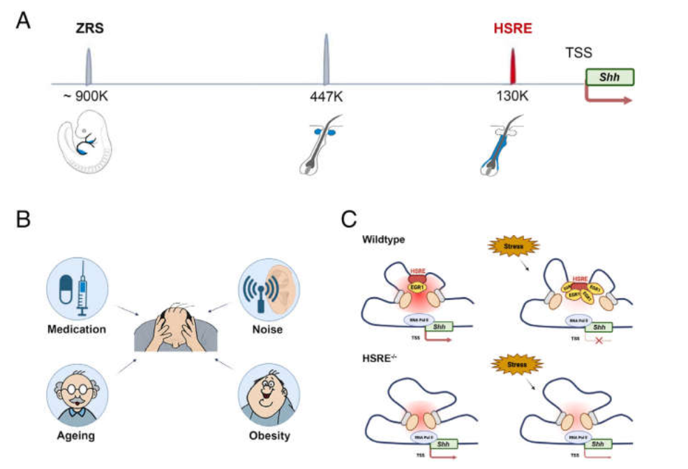 在本研究中,我们采用ATAC-seq/CHIP-seq等方法定位了小鼠毛囊的应激压力增强子,通过构建报告基因小鼠,证明这个增强子只在毛囊中有活性;进一步,我们发现敲除这个增强子,小鼠毛囊对应激压力的反应降低了,包括(1)较轻的化疗脱发反应;(2)噪声刺激下,毛囊萎缩反应消失;(3)老龄小鼠的毛发生长变慢,这个特征消失了;(4)肥胖小鼠的毛发生长变慢,这个特征也消失了。因此,多种应激压力都可以通过这个增强子影响SHH基因的表达,进而导致毛发异常。本研究还提供了缓解应激压力的方法,相关专利已获授权。