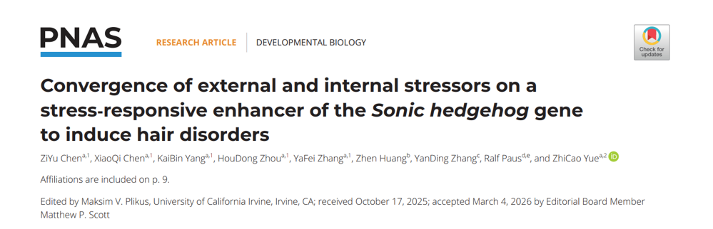 2026年3月31日,深圳大学卡尔森国际肿瘤中心乐志操教授团队在国际知名学术期刊PNAS在线发表了题为“Convergence of external and internal stressors on a stress-responsive enhancer of the Sonic hedgehog gene to induce hair disorders”的研究论文。该研究研究揭示了SHH信号通路在应激压力反应中的关键作用。深圳大学2022级硕士生陈姿妤、陈晓琪、周厚东、2020级硕士生杨凯斌、技术员张亚菲为共同第一作者,医学部乐志操教授为独立通讯作者,深圳大学为第一完成单位,福建师范大学、福建中医药大学、美国迈阿密大学为合作单位。