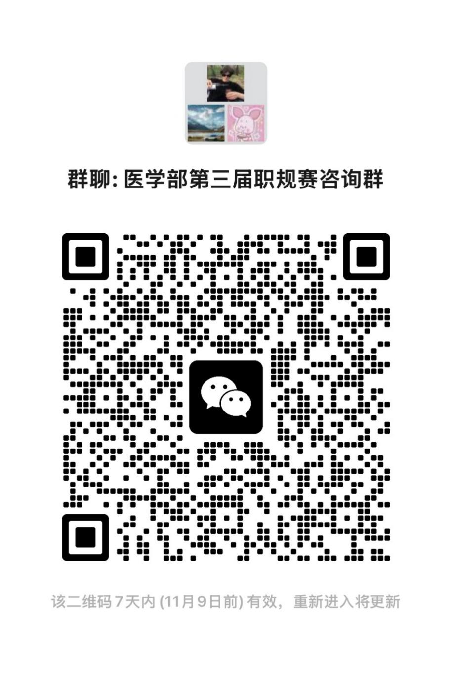 有参赛意愿或感兴趣的同学扫码进入医学部职规赛咨询群,入群申请请备注学号、专业及姓名信息,以便工作人员核对。若二维码失效,可联系以下同学进群: