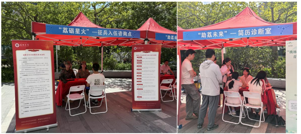 在招聘会现场,通过联动深圳大学“荔砺星火”国防教育工作室、“助荔未来”就业力提升工作室以及桃源街道团工委“桃林纳贤,‘源 ’梦青春”求职指导活动,设立征兵咨询处、就业指导服务区,为毕业生提供征兵咨询、就业政策解读、简历制作指导、面试技巧分享等一站式服务,为毕业生提供个性化的职业规划和就业建议。