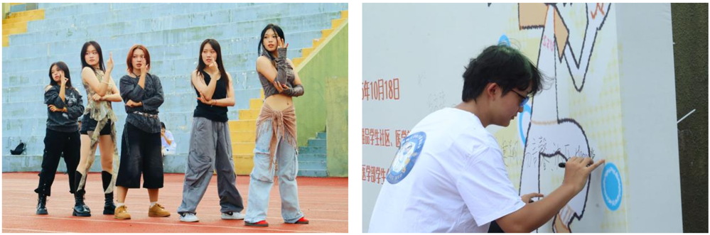 活动伊始,医学部SAVE舞队以一段节奏炸裂的舞蹈瞬间点燃全场。紧随其后的创意签到,大家在至快体育场主席台前的展板上留下个性签名,宣告狂欢正式启动。彩色跑发令枪响,跑道瞬间化作流动的调色盘:同学们身着亲手涂鸦的T恤、护目镜,相互抛洒彩粉,尖叫与笑声交织成升腾的彩色云雾。