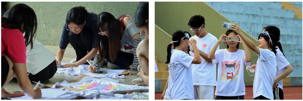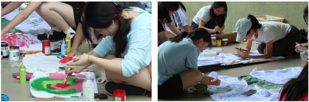 活动开始前,同学们领取了活动白色T恤与护目镜。大家拿起现场准备的油性笔、毛笔、缤纷颜料,在衣物上创意涂鸦:有人写下“音你同行”的主题,有人描绘乐队歌词、卡通人物、抽象色块......护目镜不仅守护了双眼,也让每一张笑脸都倒映出斑斓光影,成为操场上最亮眼的“移动艺术品”。