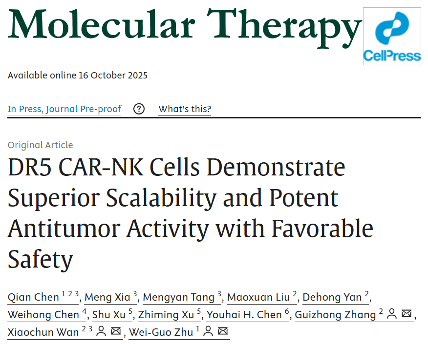 近日,深圳大学医学部基础医学院及卡尔森国际肿瘤中心朱卫国教授团队联合中国科学院深圳先进技术研究院医药所万晓春研究员团队在国际知名学术期刊Molecular Therapy在线发表了题为“DR5 CAR-NK Cells Demonstrate Superior Scalability and Potent Antitumor Activity with Favorable Safety”的研究论文,发现靶向死亡受体5(Death receptor, DR5)的CAR-NK细胞具有出色的扩增能力、抗肿瘤活性及良好的安全性,为治疗DR5阳性肿瘤,尤其是已经发生凋亡抵抗的肿瘤,提供了一种新的有潜力的安全有效策略。深圳大学讲席教授、卡尔森国际肿瘤中心主任朱卫国教授、深圳先进技术研究院万晓春研究员和章桂忠副研究员为本文共同通讯作者,深圳大学博士后陈倩为论文第一作者。