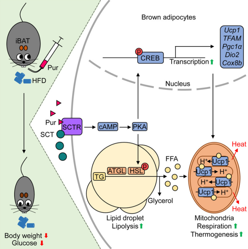 综上,这项研究揭示了Pur通过增强促胰液素受体信号、激活棕色脂肪产热从而对抗肥胖的新机制,不仅为理解能量代谢调控提供了新视角,也为开发口服有效的抗肥胖药物提供了有价值的先导化合物。未来研究可进一步优化Pur的衍生物,提高其对SCTR的选择性,推动其向临床转化。