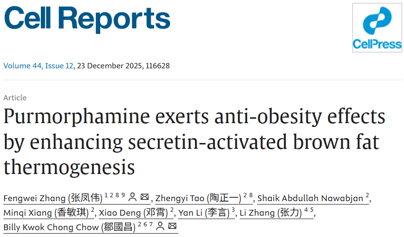 近日,深圳大学医学部基础医学院张凤伟助理教授与香港大学邹国昌团队合作在Cell Reports杂志发表了题为Purmorphamine Exerts Anti-Obesity Effects by Enhancing Secretin-Activated Brown Fat Thermogenesis的研究论文。该研究发现小分子化合物Purmorphamine(Pur)可通过增强肠道激素促胰液素(secretin)激活的棕色脂肪产热,显著减轻饮食诱导肥胖小鼠的体重,并改善其糖脂代谢,且不依赖于食欲抑制,为靶向促胰液素受体(SCTR)的抗肥胖药物研发提供了新思路。张凤伟助理教授为本文Lead Contact,深圳大学为第一完成单位。